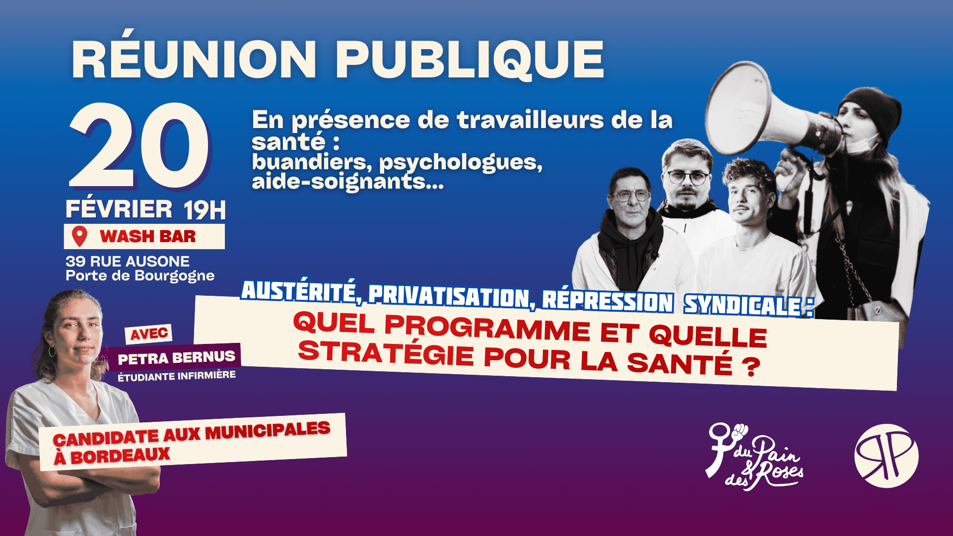 Venez découvrir la liste de Révolution Permanente aux élections municipales de Bordeaux, menée par Petra Bernus, étudiante infirmière. Elle sera accompagnée des travailleuses et travailleurs de la santé de Révolution Permanente, buandiers, aides-soignants, psychologues, ainsi que d'autres étudiants infirmiers membres de la liste.