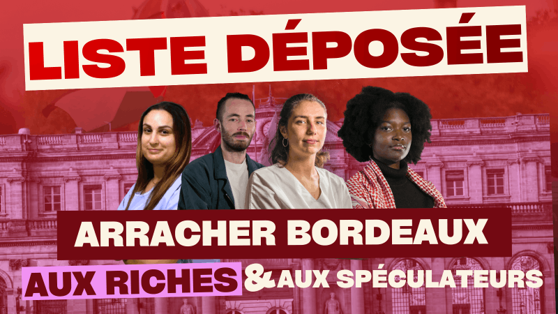 Révolution Permanente dépose à Bordeaux la liste « Arracher la ville aux riches et aux spéculateurs », menée par l’étudiante infirmière Petra Bernus. Une liste de travailleurs et d’étudiants pour porter, au Palais Rohan, la voix des classes populaires face aux politiciens professionnels. Viens les rencontrer le 13 mars à 19h à la maison cantonale pour un grand meeting en présence d’Anasse Kazib !