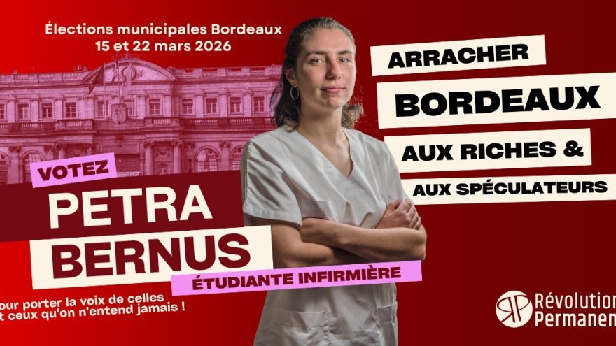 Reprendre Bordeaux aux riches et aux spéculateurs : Révolution Permanente se présente pour la première aux élections municipales avec Petra Bernus, étudiante infirmière, pour faire entendre la voix des travailleurs, de la jeunesse et des quartiers populaires. Rendez- vous le vendredi 21 novembre à la salle Amédée Larrieu pour le premier comité de campagne !